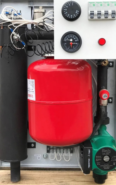 В состав миникотельной входит: корпус, стальная емкость с нагревательными элементами, аппаратура управления, расширительный бак объемом 8 литров, циркуляционный насос, автоматический воздухоотводчик, предохранительный клапан, термоманометр, регулируемый термостат, аварийный термостат, дренажная трубка, крепеж. На лицевой стороне расположена ручка регулятора температуры, индикатор включения и четыре автоматических выключателя.