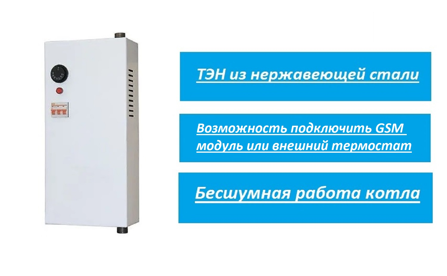 Электрический котел отопления ВОДОГРЕЙ предназначен для отопления помещений, имеющих закрытую или открытую систему отопления, работающую при давлении не более 0,3 мПа при напряжении однофазной сети 220В или трехфазной сети 380В (в зависимости от модели). Котел состоит из корпуса, стальной емкости, аппаратуры управления, закрепленной внутри корпуса. В торце стальной емкости смонтированы трубчатые тэны. На лицевой стороне расположена ручка регулятора температуры, индикатор включения и три автоматических выключателя. Присоединительные патрубки расположены в верхней и нижней части котла, что улучшает циркуляцию теплоносителя, позволяет производить монтаж и улучшает эстетический вид системы отопления.