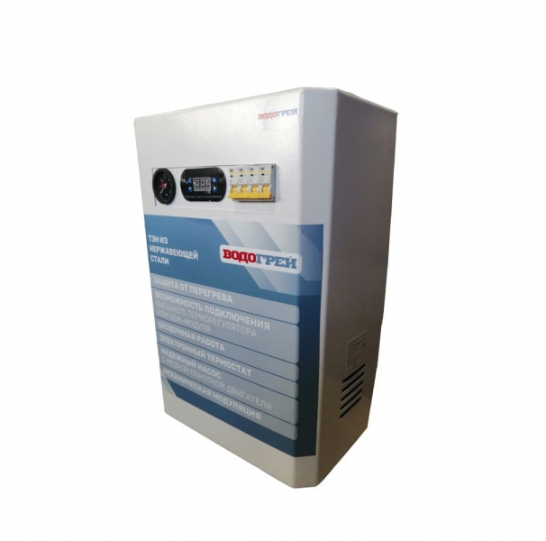 Электрическая миникотельная ВОДОГРЕЙ предназначена для отопления жилых и промышленных помещений с закрытой отопительной системой, работающей при давлении не более 0,3 Мпа. Для подключения миникотельной к электроэнергии прибора необходимо напряжение 1-фазной сети 220 В или 3-фазной сети 380 В (в зависимости от модели).