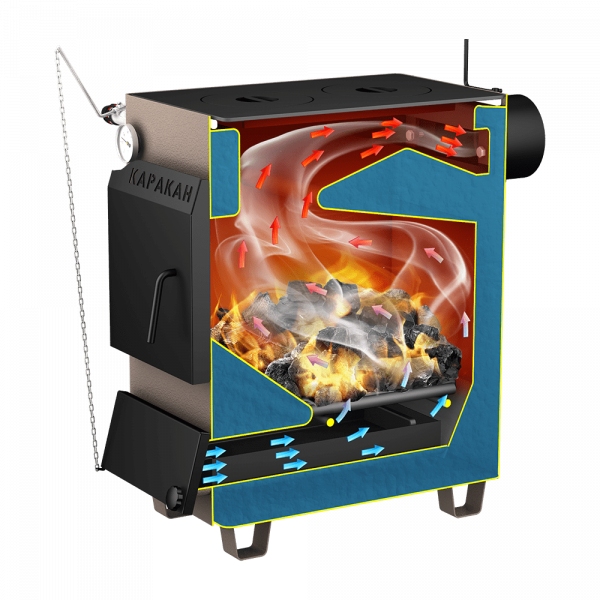 Котёл твердотопливный комбинированный отопительный Каракан-14 ТПЭ. Разработан для водяного отопления жилых зданий, различных сооружений, помещений и индивидуальных жилых домов, коттеджей , которые оборудованы системой отопления с естественной или принудительной циркуляцией. Площадь обогрева до 140 кв. метров. Котёл предназначен для сжигания твердого топлива длительное время. Такие виды топлива как :каменного уголь, бурый уголь, дрова и электричество. Имеет высокий КПД. Компактность и неприхотливость в обслуживании. В модели есть чугунная варочная плита с одной конфоркой что очень удобно для приготовления пищи. Для поддержки положительной температуры после сгорания твёрдого топлива можно установить электрический ТЭН до 5 кВт и регулятор тяги.