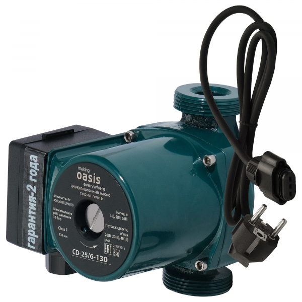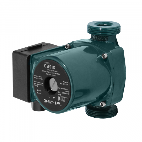 Циркуляционный насос Oasis C 25/6 обеспечивает циркуляцию воды в системах отопления, а также системах обогрева полов. Прибор имеет небольшие габаритные размеры и вес, работает практически бесшумно и потребляет мало электроэнергии. Циркуляционные насосы «Oasis» применяют в загородных домах, так как естественная конвекция не сможет обеспечить равномерный прогрев всех отопительных приборов.